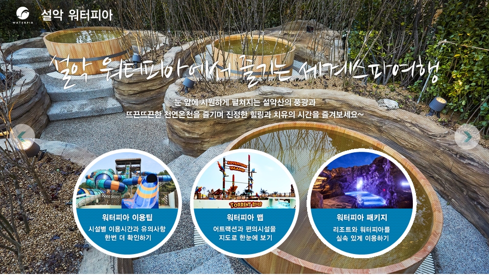 설악 워터피아는 강원도 속초에 위치한 대규모 온천 워터파크로, 설악산의 절경과 천연 온천수를 함께 즐길 수 있는 국내 대표 워터 리조트입니다. 가족, 연인, 친구 누구와도 즐길 수 있는 다양한 풀장과 슬라이드, 키즈존, 스파존이 있어 사계절 내내 사랑받고 있습니다.