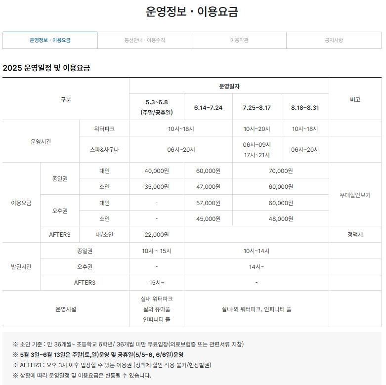 | 현장 대여 가능 품목 | 수건, 수영복, 방수팩, 구명조끼, 튜브 등 |