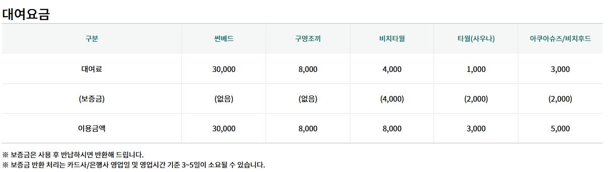| 락커/대여 서비스 | 락커, 튜브, 방수팩, 수영복 등 대여 가능 |