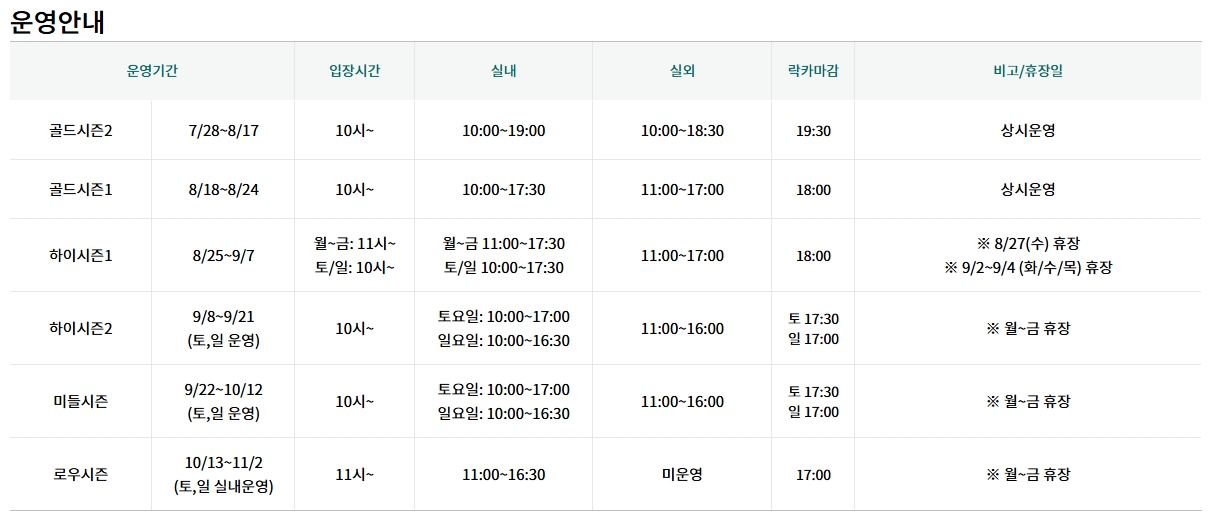 | 운영시간 | 10:00 ~ 17:00 (날씨/성수기별 변동 가능) |