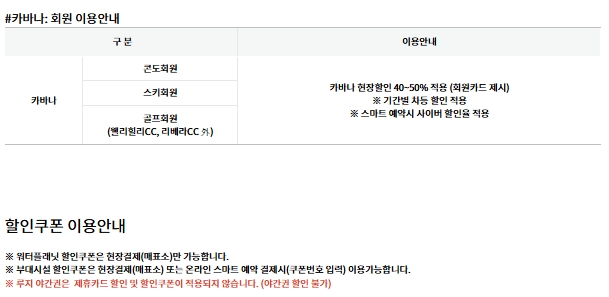 | 리조트 연계 할인 | 최대 40% | 웰리힐리파크 숙박 고객 대상 패키지 할인 |