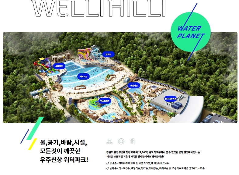 웰리힐리파크 워터플래닛은 강원도 횡성군에 위치한 사계절 종합 리조트 웰리힐리파크 내에 운영되는 워터파크로, 맑은 공기와 청정 자연 속에서 물놀이를 즐길 수 있는 여름철 명소입니다.