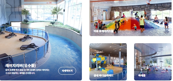실내·실외 모두 운영되는 워터존, 키즈 전용 풀장, 튜브 슬라이드, 파도풀 등 다채로운 시설이 마련되어 있으며, 휴식 공간도 잘 갖추고 있어 가족 단위 고객에게 특히 인기가 높습니다.